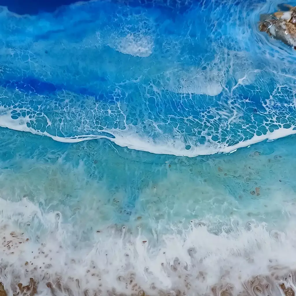 Cada camada de resina é cuidadosamente aplicada à mão, criando profundidade, brilho e movimento que convidam à contemplação.