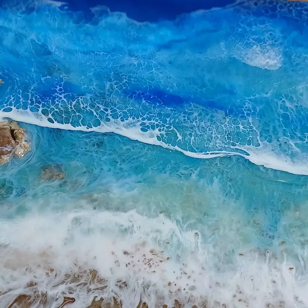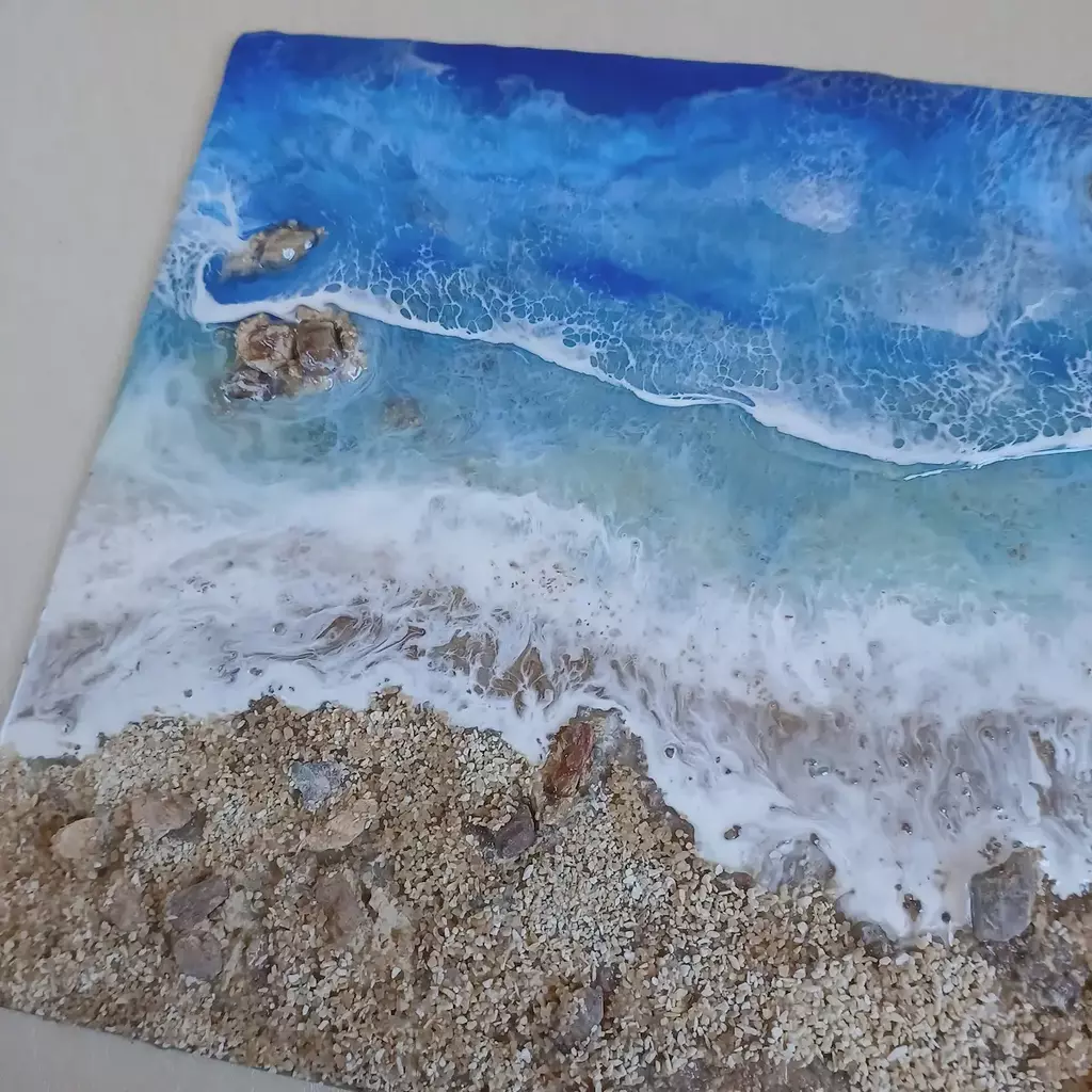 Este quadro em resina epóxi revela a beleza das águas cristalinas do oceano em contraste com rochas naturais e texturas que remetem à areia molhada pela maré.