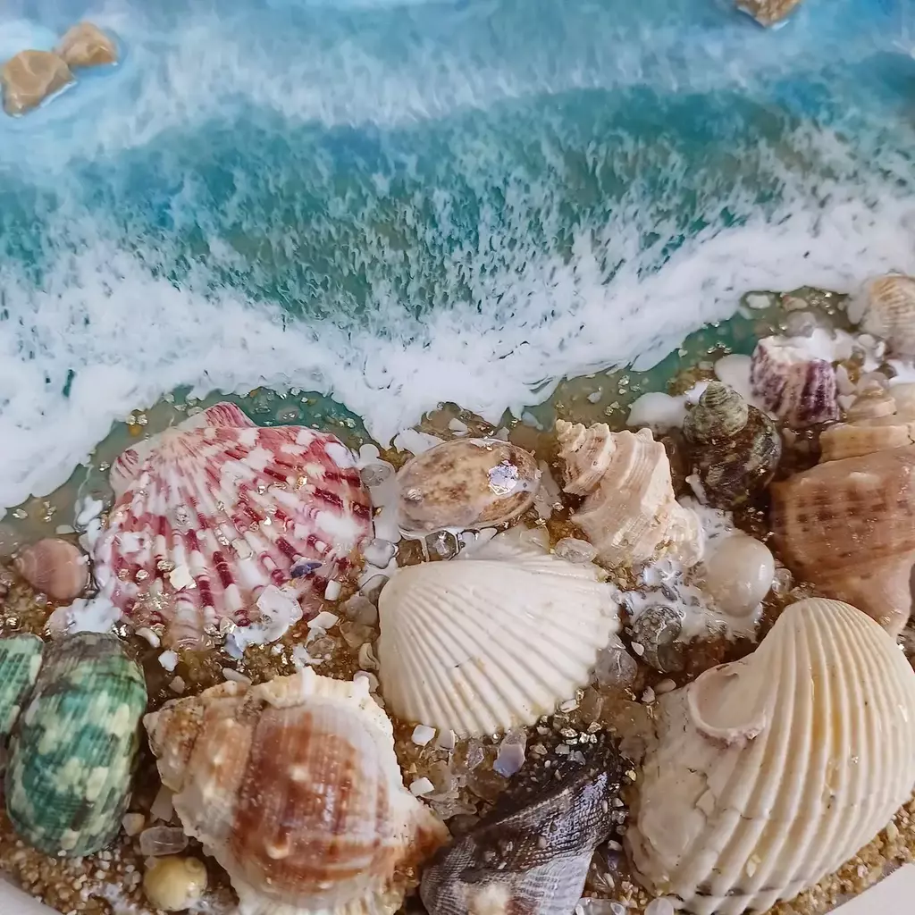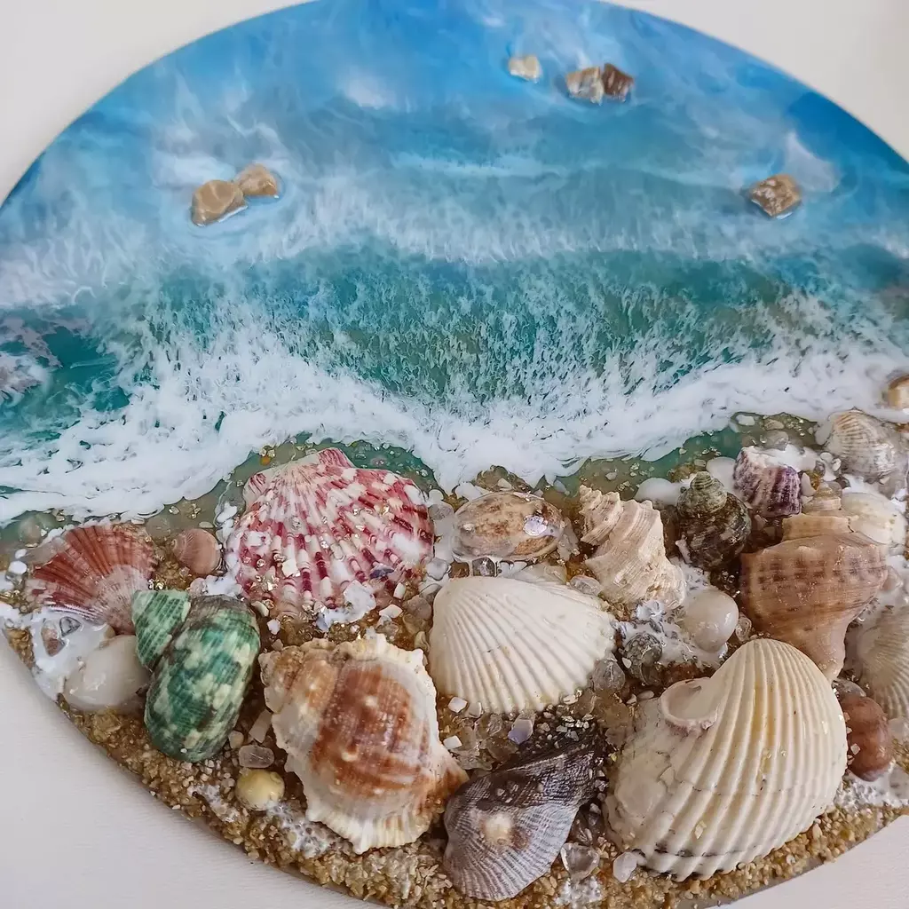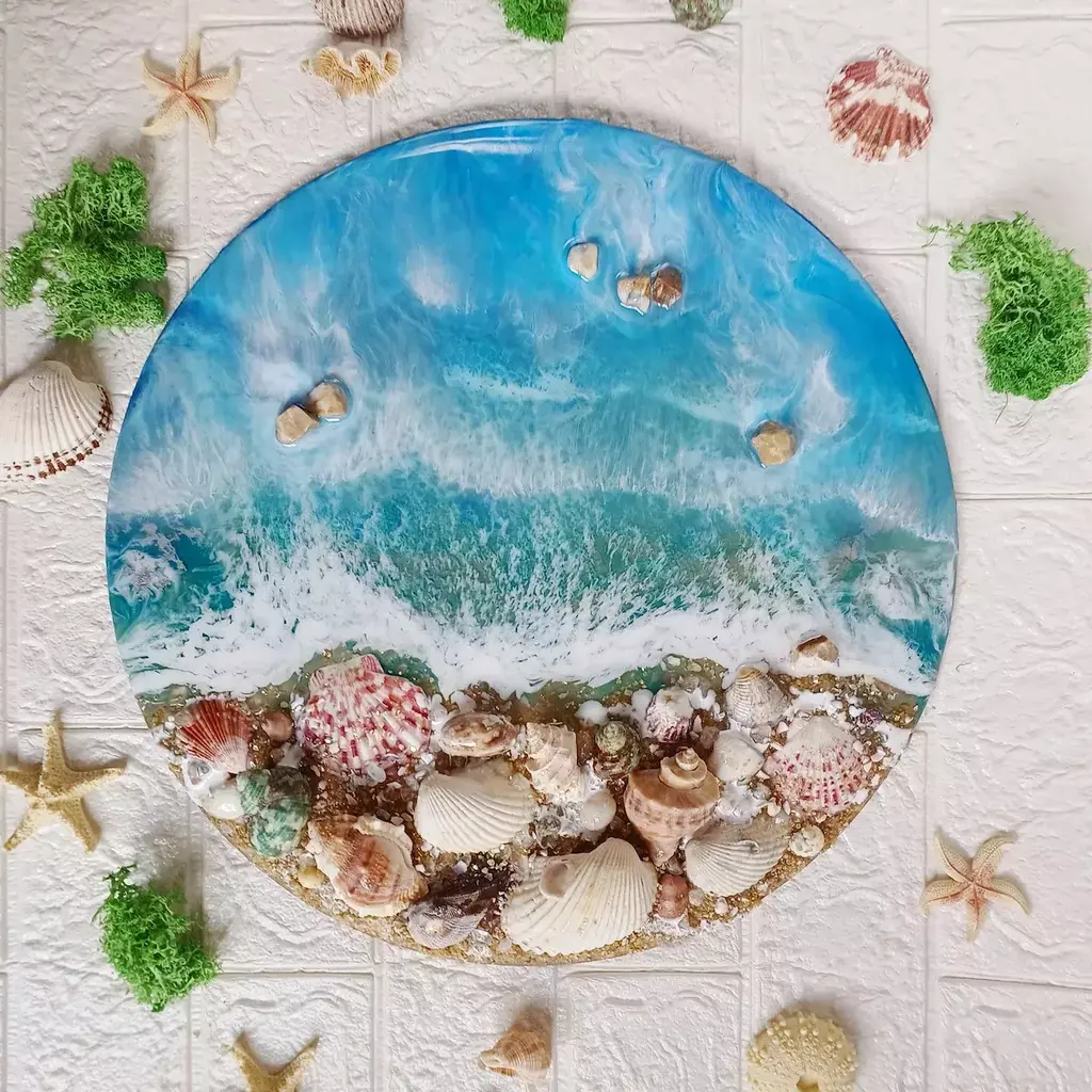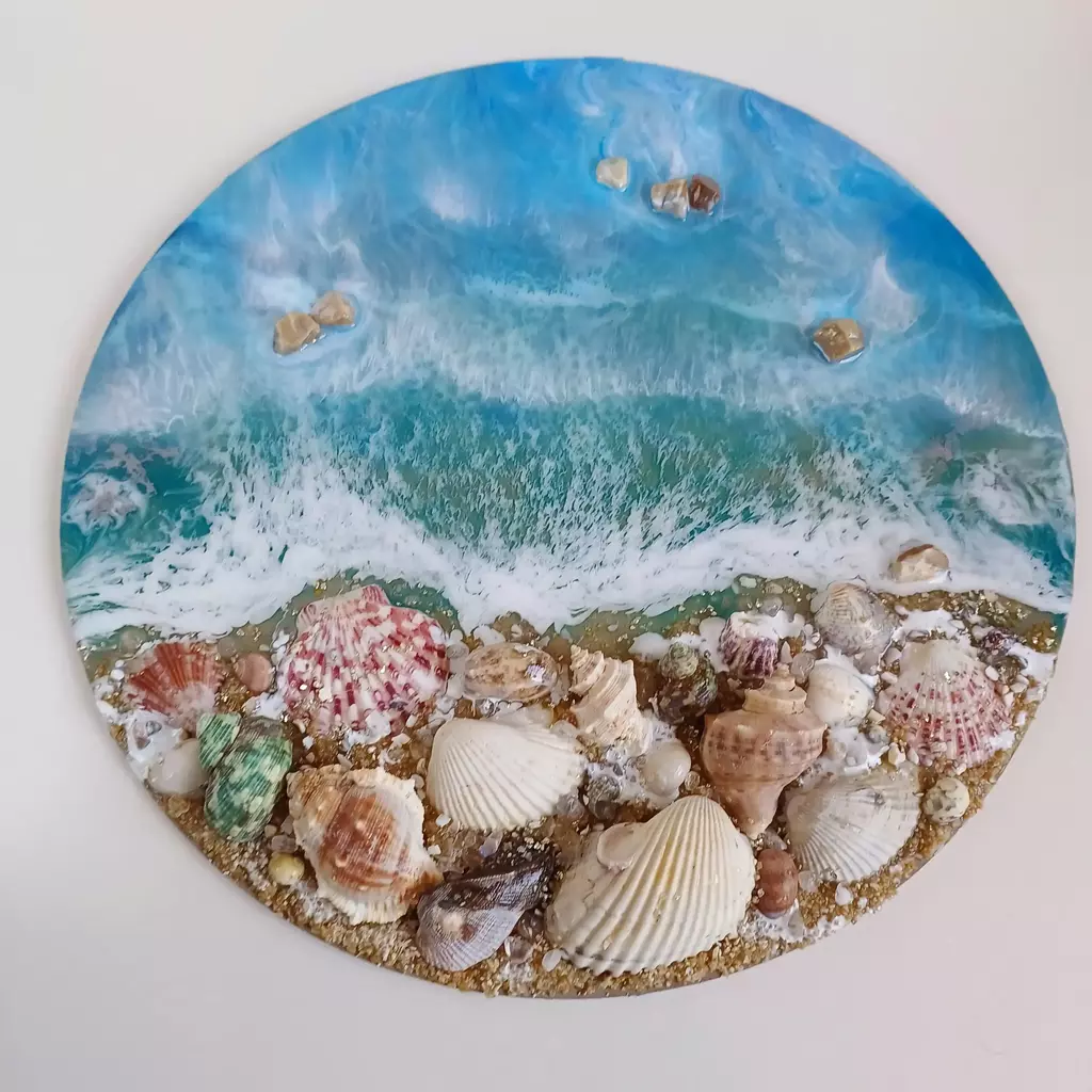 🌟Quadro Mar com Conchas – Redondo em MDF e Resina Epóxi – 35 cm